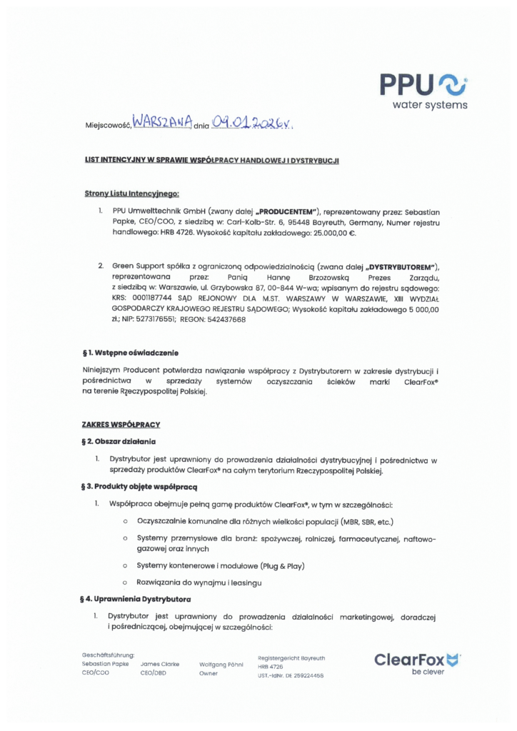 Nasza firma jest dystrybutorem modułowych oczyszczalni ścieków marki ClearFox®. Jako oficjalny partner Clearfox GmbH na terenie Polski, Green Support Sp. z o.o. jest autoryzowany do prowadzenia działań marketingowych oraz pośredniczenia w sprzedaży i dostawie nowoczesnych oczyszczalni ścieków. Gwarantujemy dostęp do sprawdzonych, niemieckich technologii, z pełnym wsparciem i formalną umową podpisywaną bezpośrednio z Producentem. Więcej przetworzonych ścieków za mniejsze koszty – ClearFox® oferuje inteligentne rozwiązania dla oczyszczalni ścieków komunalnych i przemysłowych.